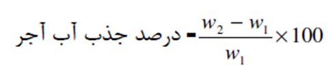 نتایج جذب آب بر حسب درصد افزایش نمونه های خشک با تقریب 1/0 درصد طبق رابطه زیر محاسبه می شود:
